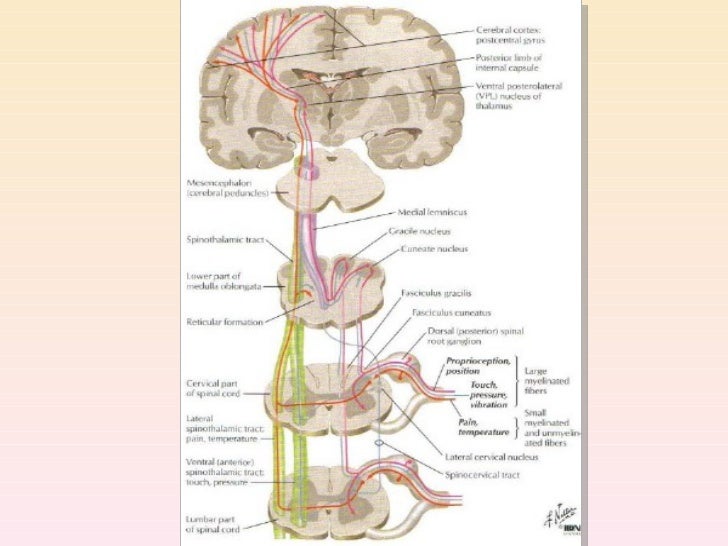 Ese núcleo es una estructura laminar que consta de seis capas concéntricas La más interna es la capaI, y la más superficial,la capa VI. Los axones de la retina que terminan en este núcleo provienen de la retina nasal contralateral y de la retina temporal ipsolateral, y transportan, en consecuencia, una información punto a punto del campo visual contralateral. Las fibras nasales contralaterales terminan en las capas I, IV y VI, y las fibras temporales ipsolaterales, en las capas II, III y V. La información de ambos ojos sigue segregada en el núcleo geniculado lateral dorsal, al igual que las señales provenientes de las células ganglionares X e Y de la retina La entrada de las células Y termina en las capas I y II, que se denominan capas magno celulares porque contienen neuronas bastante grandes. Esta es una vía de conducción rápida, con ceguera para los colores, pero con una información localizadora eficaz. Las capas III a VI se denominan parvo celulares porque contienen neuronas bastante pequeñas que reciben señales de las células X, que transmiten información del color y de la forma. Por tanto, la información de la retina se procesa a lo largo de al menos dos vías paralelas: 1) una corriente dorsal que transporta información de los bastones y las grandes células ganglionares(Y)que dan información específica de la localización y del movimiento, y 2) una corriente ventral que transporta información del color y de la forma desde los conos y las pequeñas células ganglionares (X).